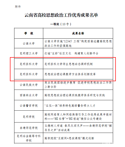 近日,省委高校工委公布2017年云南省高校思想政治工作优秀成果评审结果。经各高校推荐申报、材料审核、专家评审、网上公示等程序,共评出高校思想政治工作优秀成果一等奖10个,二等奖12个,三等奖21个,我校《18luck备用登录师生思想动态调研机制》和《思想政治理论课教学方法体系创新改革》2项成果获得一等奖。