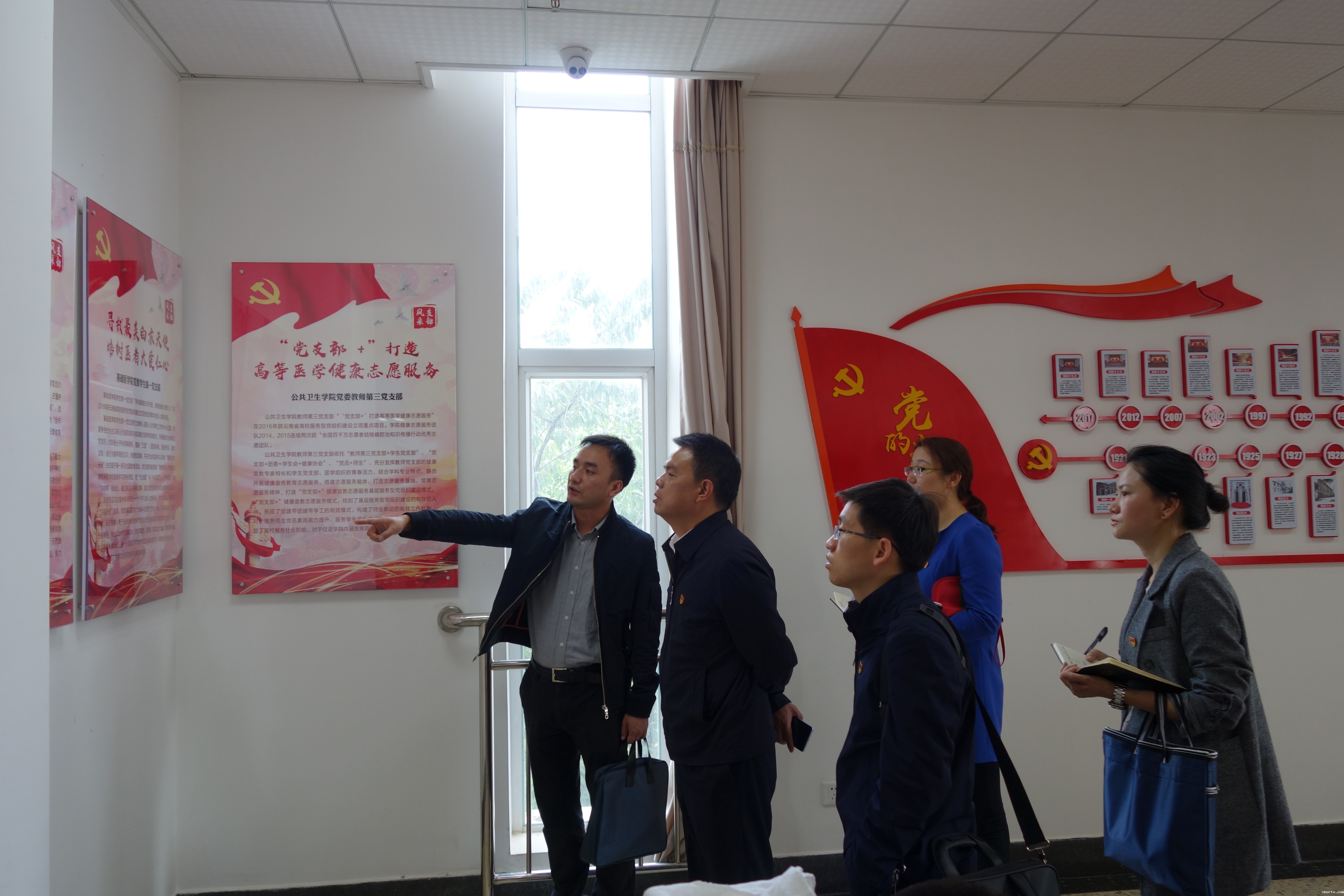 雷洋一行还调研考察了公共卫生学院党员活动室和党建文化走廊,并到学校党委组织部查阅了学校党建工作相关材料。
