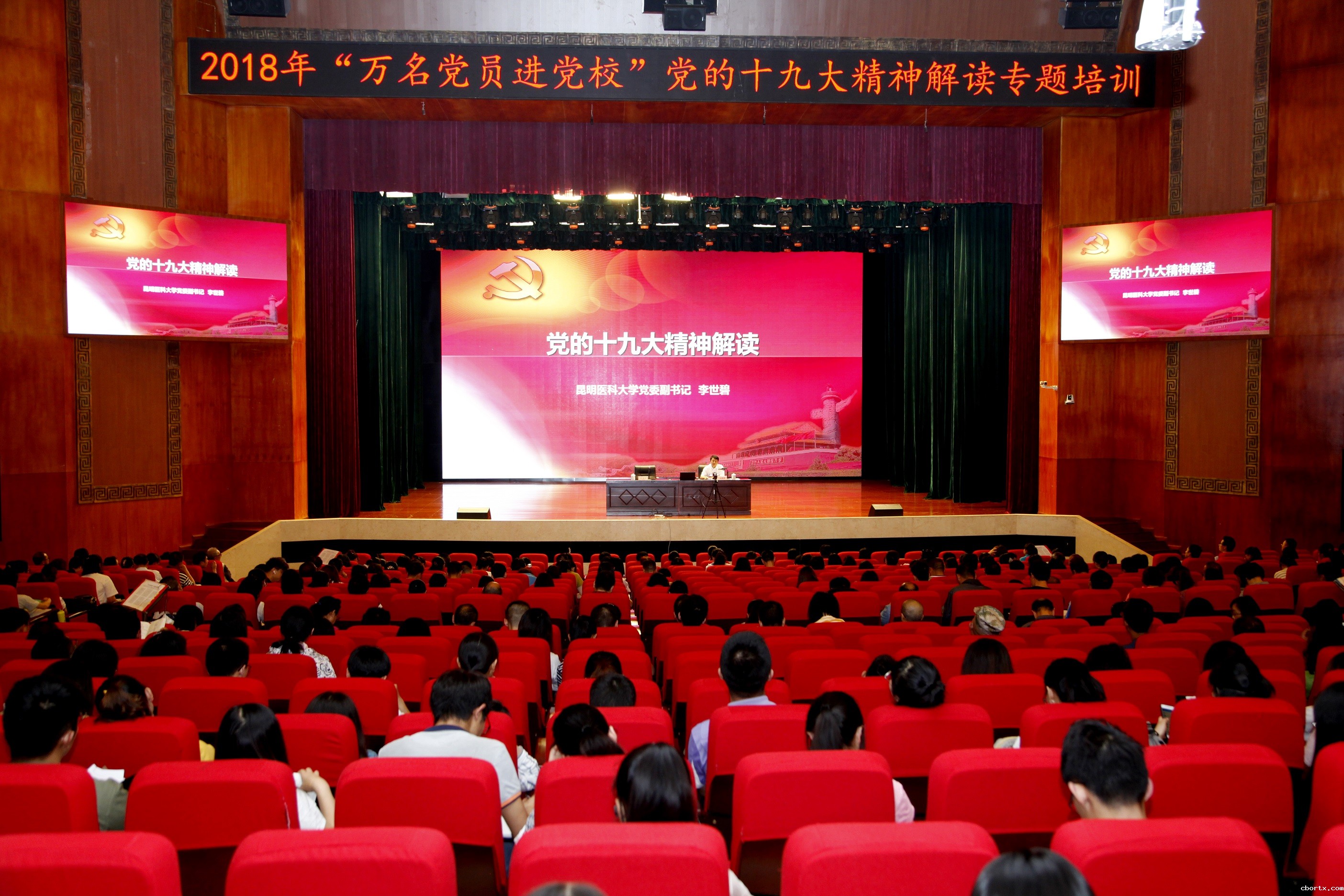 5月18日下午,学校“万名党员进党校”专题培训第五讲“党的十九大精神解读”在学生会堂举行。专题培训由校党委副书记李世碧主讲,校属19个单位党委选派的1200余名教医护职工和学生党员参加培训。培训由校党委组织部部长王贵义主持。
