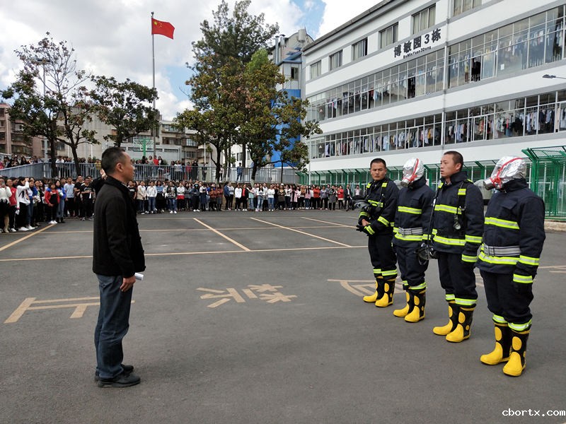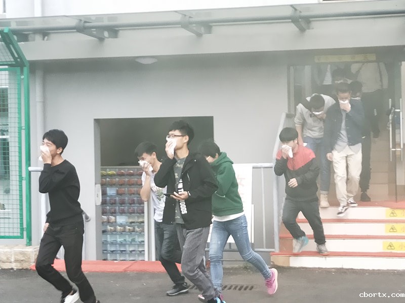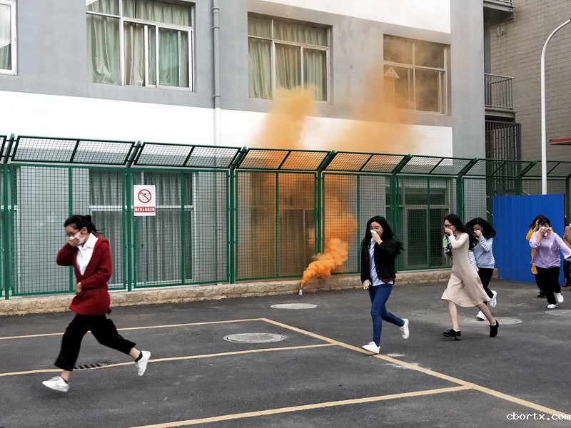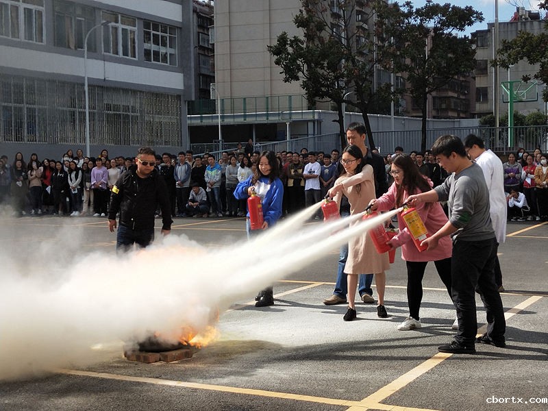 13:15分,徐绍琼宣布消防演练正式开始。随着消防警报声响起,消防广播发出火灾报警信号,灭火行动组、伤员救护组第一时间赶赴现场,展开人员搜救和灭火行动。博敏园2栋、3栋学生宿舍各楼层老师迅速组织本楼层学生有序地从最近的楼梯口向下疏散,同学们按照规定路线和逃生疏散技巧,用湿毛巾捂住口鼻、弯腰低姿、快速有序地撤离宿舍,前往指定地点集合,整个疏散演练活动历时3分40秒。第二阶段开展了干粉灭火器和消防水枪灭火训练。保卫处及消防专业人员现场介绍了消防设施设备,讲解灭火器的使用方法,部分教职员工和学生代表使用干粉灭火器现场进行了灭火体验。保安人员、后勤员工开启消防栓、抛掷消防水带、使用消防水枪开展了灭火实操训练。