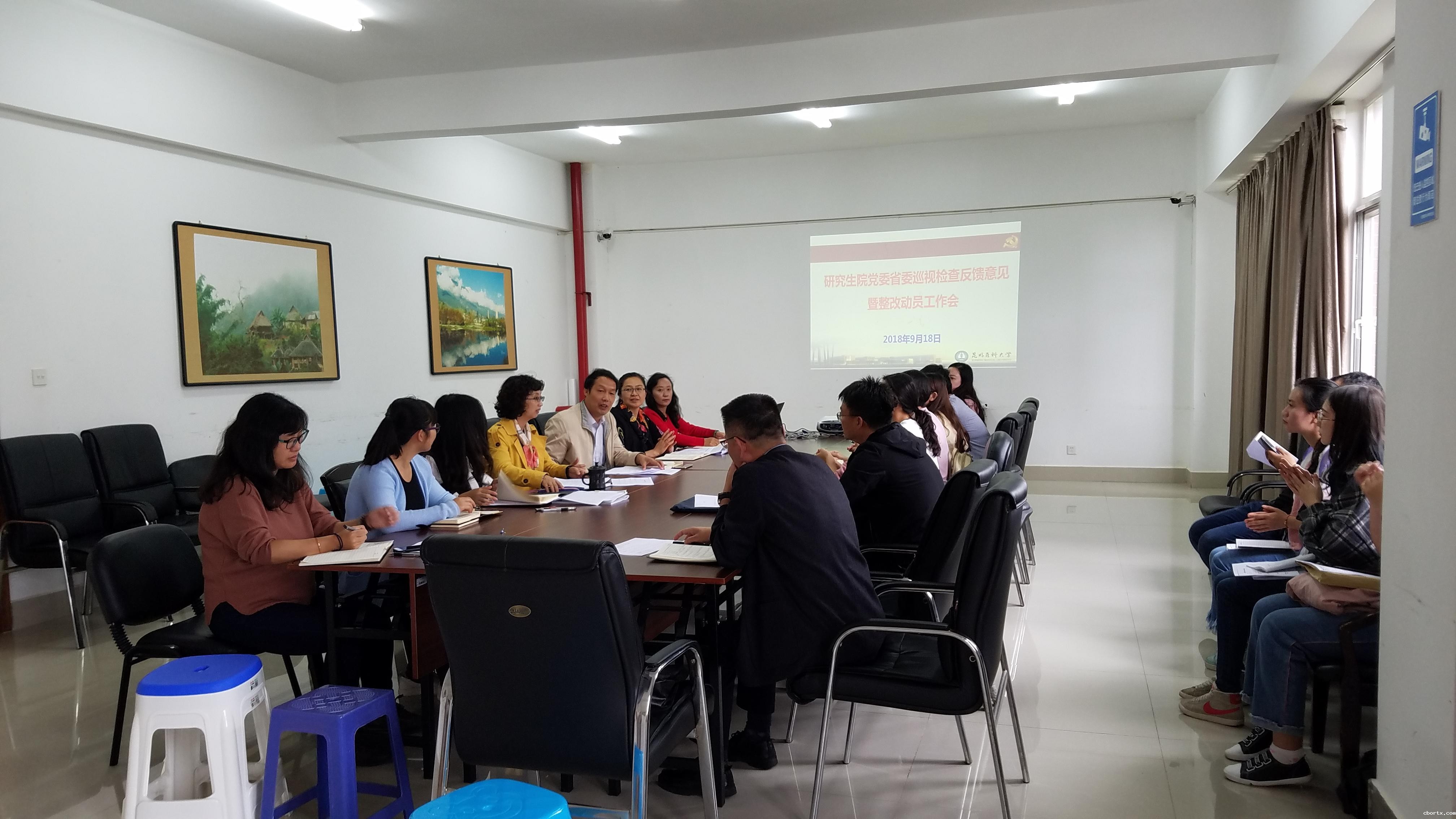 为落实学校巡视整改任务,研究生院党委于9月18日下午在呈贡校区至真楼315会议室召开省委巡视检查反馈意见暨整改工作动员会。研究生院党委委员、教师党支部书记、在昆非直属研究生培养单位党建思政工作负责人及研究生党支部书记共20余人参加会议。会议由研究生院党委王金德副书记主持。