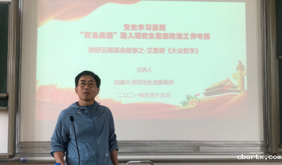 研究生处党委委员刘建兴作题为《讲好云南革命故事之-艾思奇<大众哲学>》的讲座。他从艾思奇及《大众哲学》简介、《大众哲学》的写作特点及主要内容、《大众哲学》给我们的启示以及体会等方面,结合聂耳与《义勇军进行曲》、红军巧渡金沙江等云南红色革命故事作了讲解。宣讲为进一步传承“红色基因”,探寻“红色基因”融入学校研究生思想政治工作的有效对策奠定了坚实基础。