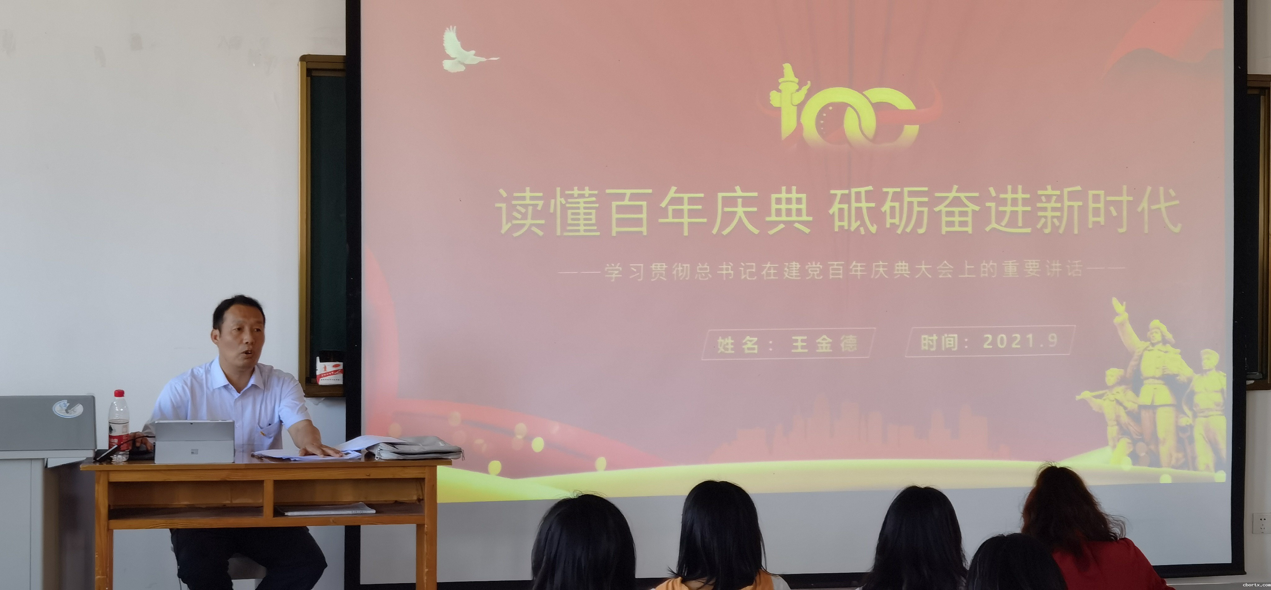 周年大会重要讲话精神,分为四个专题展开。党委书记王金德作题为“读懂百年庆典 砥砺奋进新时代”的宣讲报告。他从“回顾百年光辉历程