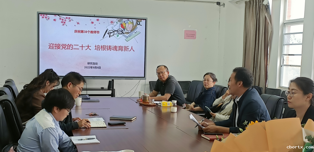 2022年9月8日上午,研究生院在至真楼举行庆祝第38个教师节座谈会暨退休职工欢送会,会议以“迎接党的二十大 培根铸魂育新人”为主题。研究生院全体职工、退休教师参加了会议。