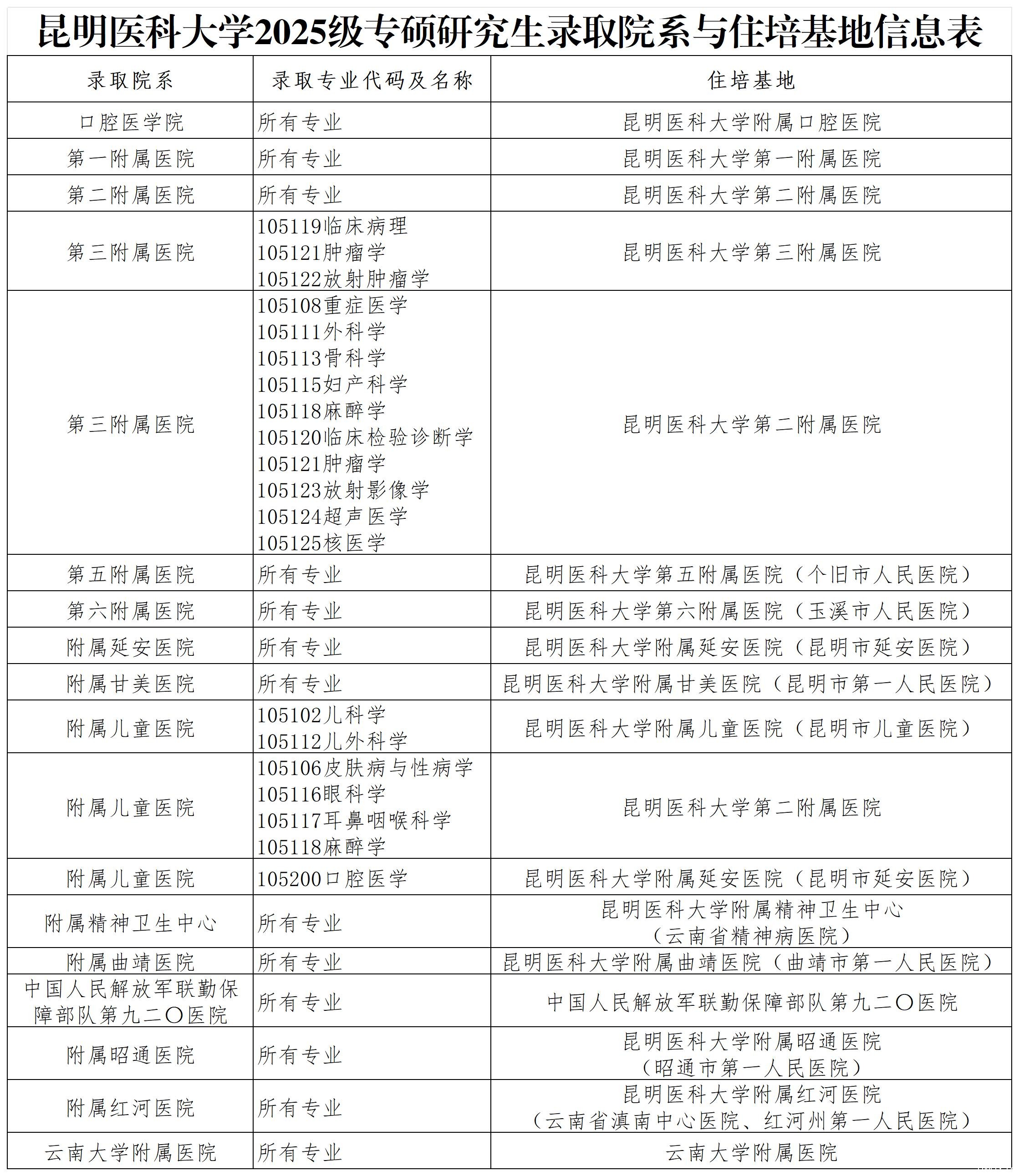 2025级临床医学、口腔医学硕士专业学位研究生新生报名时按录取通知书上注明的录取专业、住培专业等信息,认真、准确、如实填报报名信息。我校相关二级培养单位涉及对应的住院医师规范化培训基地详见下表,报名时准确选择对应的住培基地报名。