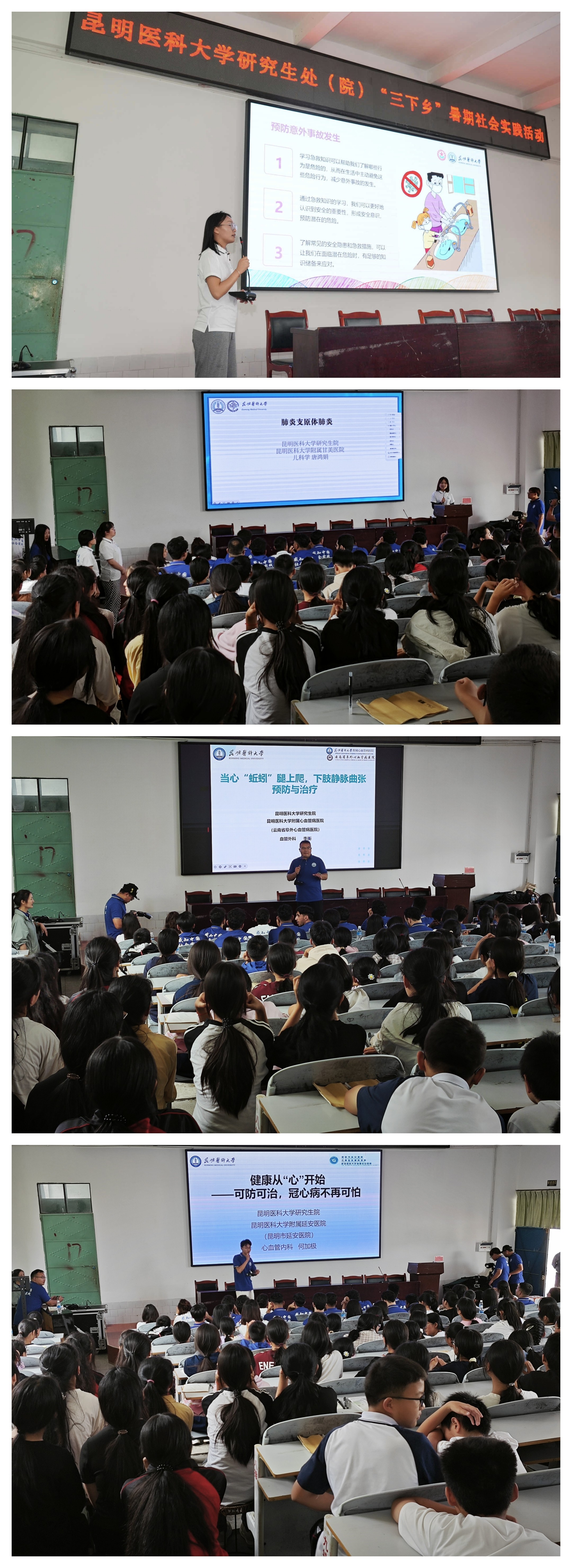 研究生处(院)社会实践活动队前往龙陵县第三中学为当地200余名中小学生开展了四场次的健康知识宣讲。活动中,4名研究生结合专业所学,用通俗易懂的语言和生动有趣的互动形式向孩子们讲解了中小学生急救常识、如何预防肺炎支原体肺炎等健康知识,提升了青少年自我保护能力和健康意识。