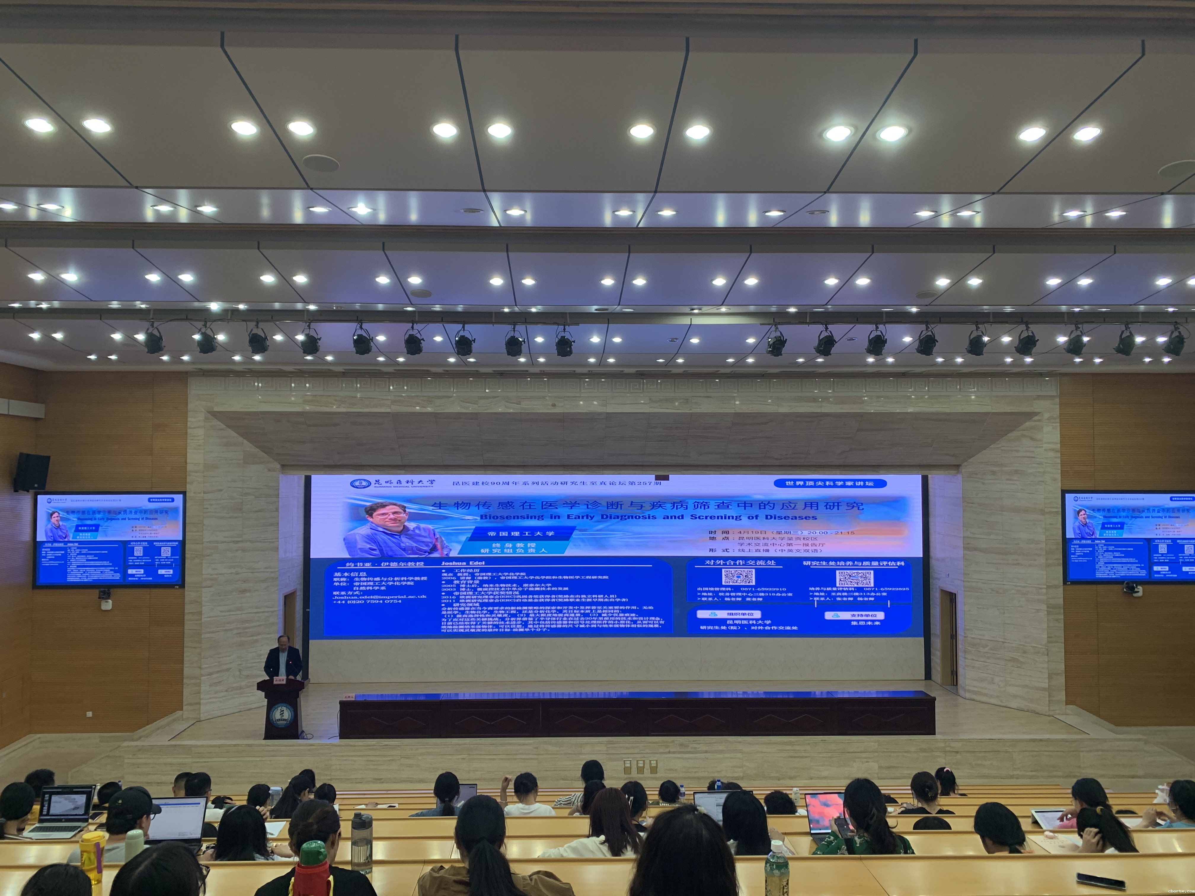 约书亚·伊德尔教授是帝国理工大学化学院自然科学系的生物传感与分析科学教授。本次讲座以早孕和帕金森病检测为例,向研究生介绍生物传感器的类型和运作机制,以及单分子生物传感器这项前沿生物传感技术。来自基础医学院、药学院、公共卫生学院、法医学院、第一附属医院、第二附属医院、第三附属医院的博士、硕士研究生200余人参加讲座。