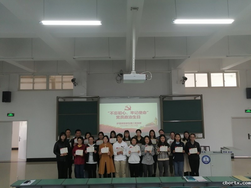 2019年11月19日,护理学院学生第二党支部在东苑大教室一开展“不忘初心、牢记使命”党员政治生日活动。在活动中,由党支部书记吴青同志向2019年下半年过政治生日的21名同志送上了生日贺卡,并对所有党员提出了要求:请每位党员认真反思自己入党的初心是什么,并结合“不忘初心、牢记使命”主题教育对照党章党规找差距个人检视环节深入分析自己的不足,在今后的学习、实习生活中有目标的整改和完善自我,成为一名合格、优秀的共产党员。