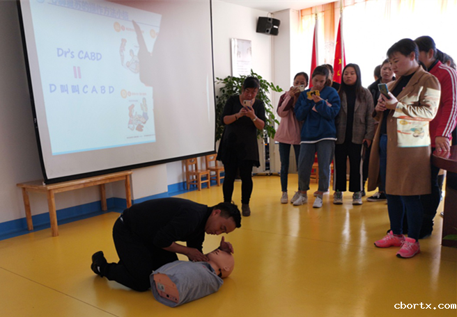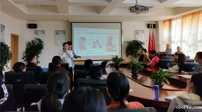 袁源同志从儿童发生气管异物梗塞和呼吸、意识丧失两方面给幼儿园教师讲解了海姆立克法与CPR两种急救方法。并请学生党员指导教师们按照示范操作,进行模型实际演练。
