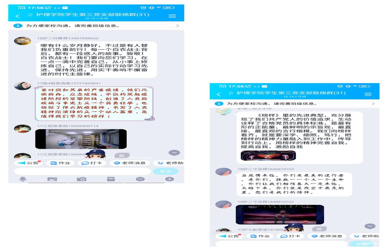 2021年3月22日,按照学校党委组织部《关于认真做好《榜样5》专题节目学习收看的通知》要求,18luck备用登录护理学院学生第三党支部组织全体党员通过线上参与方式,认真学习收看在中央电视台CCTV-1播出的《榜样5》专题节目。观看《榜样5》专题节目后,32名党员同志积极在支部QQ群展开讨论,并分享感悟。