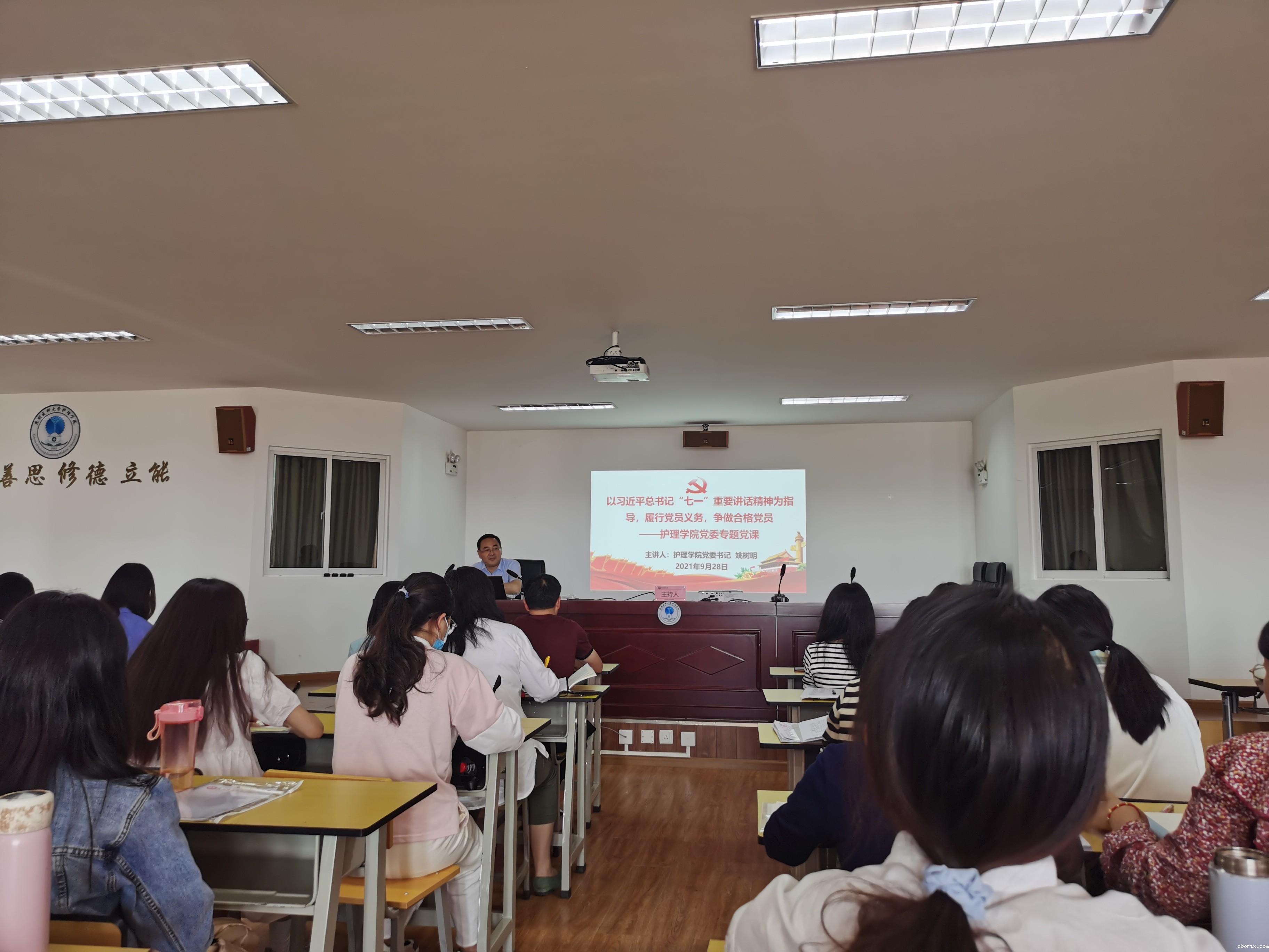 2021年9月28日,护理学院党委组织全体党员开展“以习近平总书记七一重要讲话精神为指导,履行党员的义务,争做合格党员”为主题的党史学习教育专题党课学习,本次党课由护理学院党委书记姚树明同志主讲,党委副书记聂兆祥同志主持。