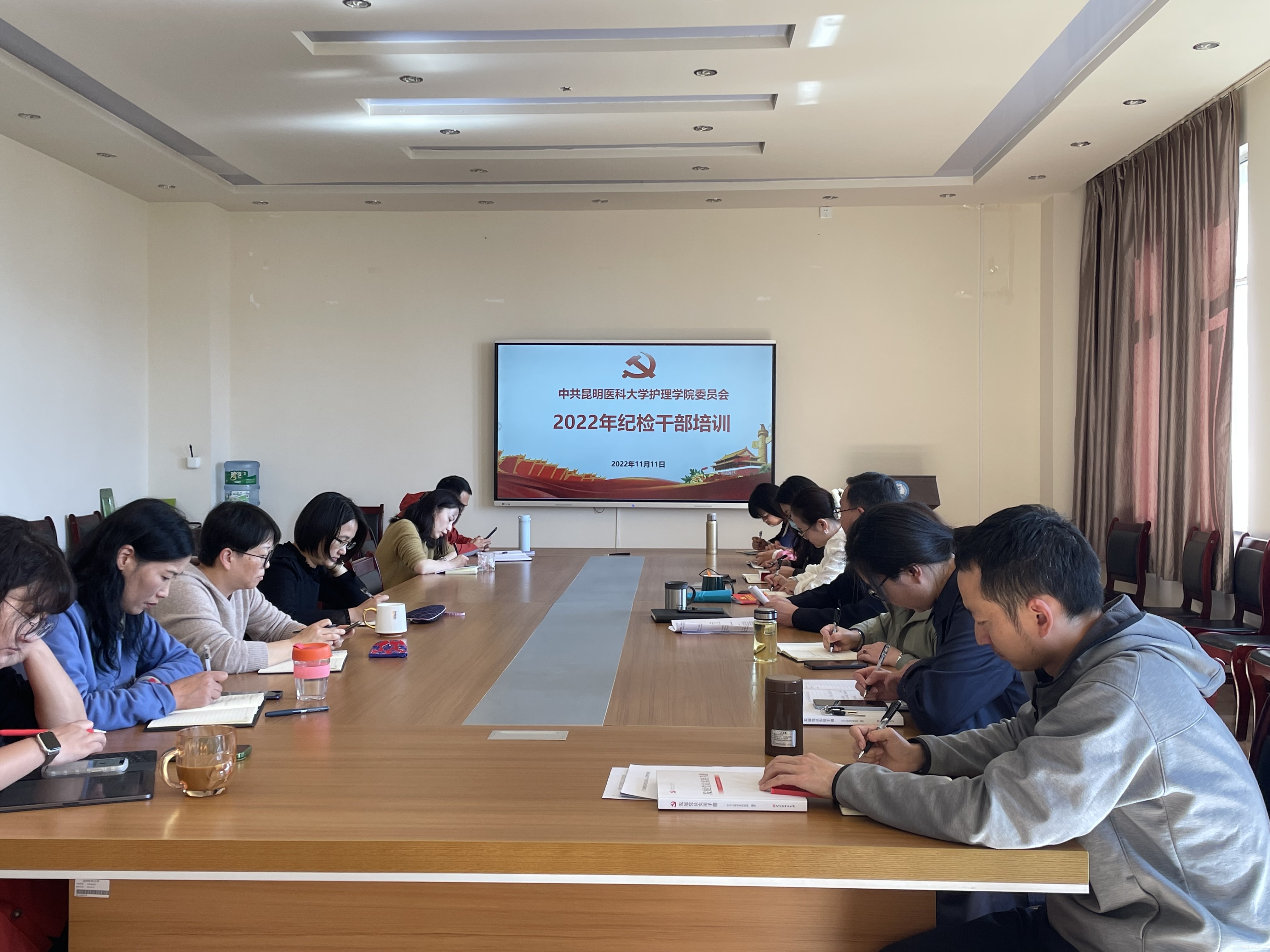 2022年11月11日下午,护理学院党委在护理学楼502会议室组织开展2022年纪检干部培训工作,培训人为学院党委书记姚树明,学院党委纪检委员、院属各党支部纪检委员、副科级及以上干部参加培训。