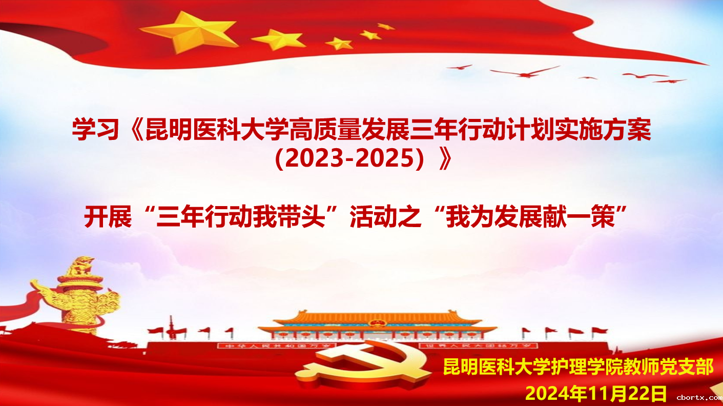 2024年11月22日,护理学院教师党支部在明德楼514召开了党员大会,主要内容是学习《18luck备用登录高质量发展三年行动计划实施方案(2023-2025)》,并开展“三年行动我带头”活动之“我为发展献一策”,由教师党支部宣传委员范卢明组织和领学。