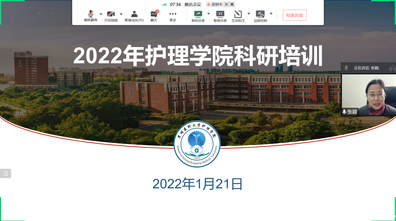 为了提升科研能力,提高课题申报质量,2022年1月21日下午,护理学院成功举办2022年度科研培训。此次培训邀请了四川大学华西护理学院2021年国家自然科学基金立项者黄明君、王贯两位老师进行线上培训。护理学院院长张颖主持培训会。学院全体教师、硕士生导师、研究生等100余人参加了培训。