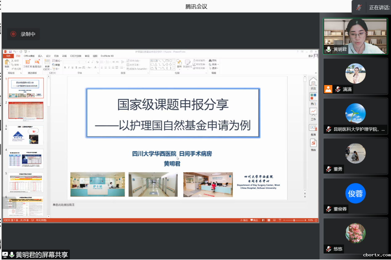 黄明君老师以《国家级课题申报分享-以护理国自然基金申请为例》为题开展培训,主要从护理国自然立项现状、如何选题、如何组织多学科交叉融合团队、申请书撰写技巧等方面进行了精彩的讲授。王贯老师以《标书写作心得分享》为题开展培训,从国自然基金受理与评审流程、指南变化、科学属性问题的撰写到报告正文的撰写,王老师用通俗易懂的语言进行了详细解读。