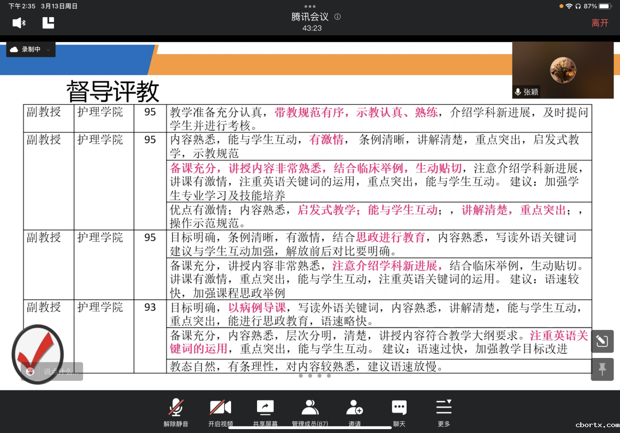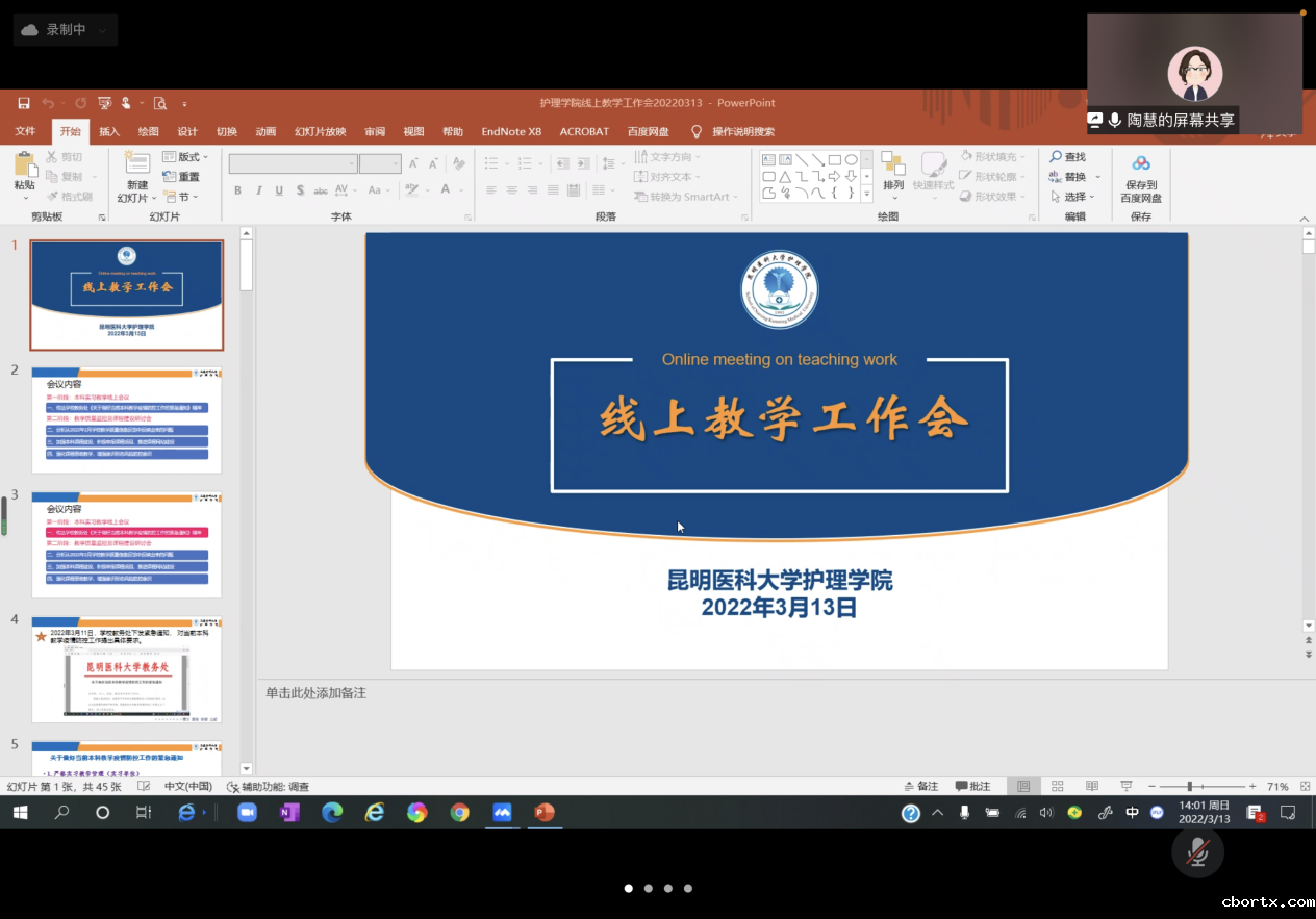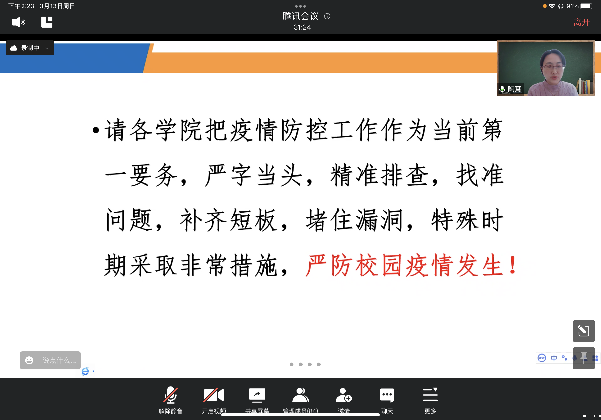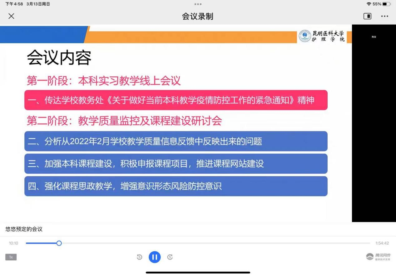 由于目前疫情防控形势严峻,根据学校教务处“关于做好当前本科教学疫情防控工作的紧急通知”以及学校学生工作部“关于贯彻学校疫情防控领导小组办公室会议精神进一步加强疫情防控工作的紧急通知”的相关要求,护理学院于3月13日下午紧急召开线上教学工作会议,对实践教学、教学质量监控及课程建设等各方面进行部署安排。会议由护理学院副院长陶慧主持,分本科实习教学部署、教学质量监控及课程建设研讨两个阶段进行。