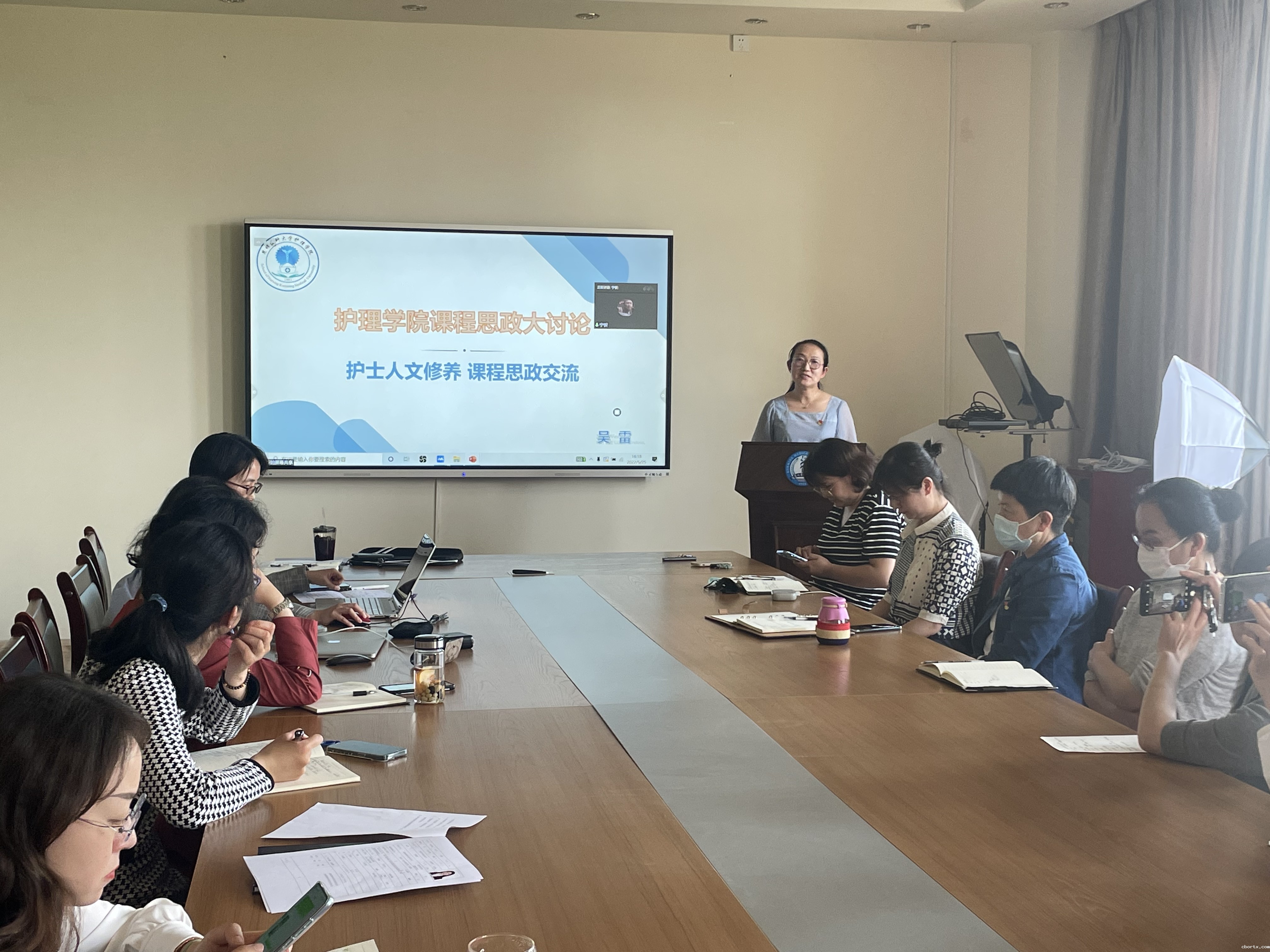 会议第二阶段,陶慧副院长组织教师围绕学院各门课程如何进行课程思政建设进行了讨论。《护士人文修养》课程负责人吴雷老师分享了课程组将优秀传统文化融入课程思政的经验。陶慧副院长也作为《护理学导论》的课程负责人从第一课堂思政案例教学法运用与课堂有仪式感的思政结尾设计、第二课堂思维导图竞赛活动开展两个路径介绍了该课程组思政建设的实践。