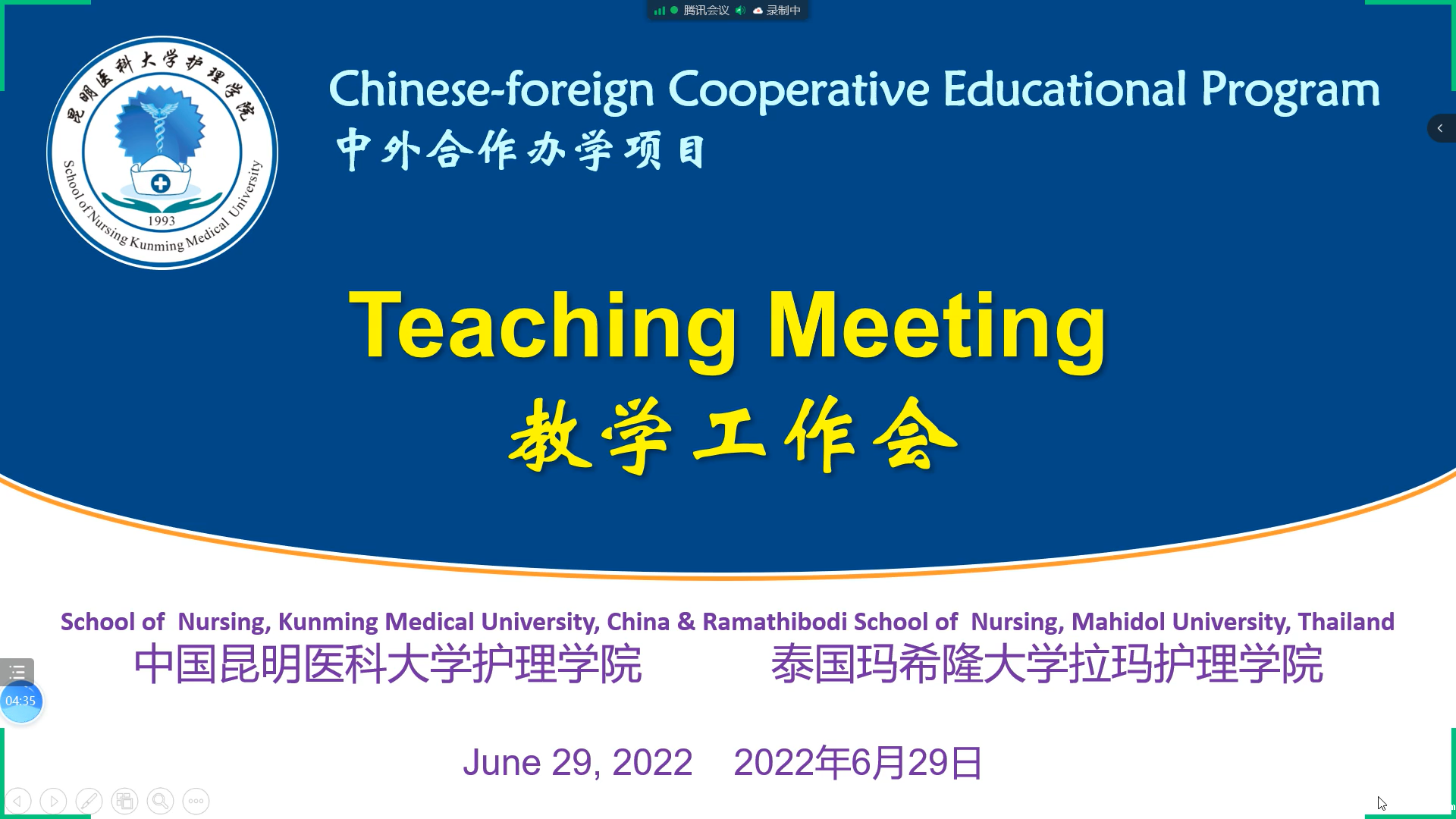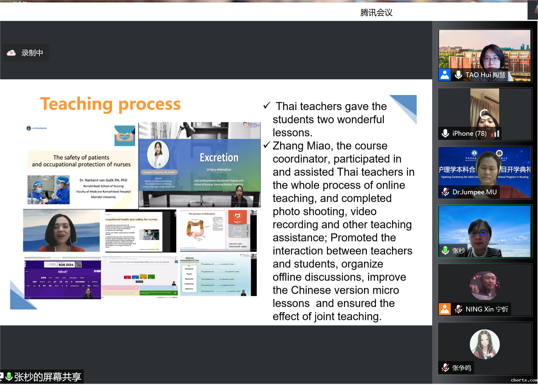 本学年开展中泰合作授课的专业课程为《护理学导论》和《基础护理学1》,课程负责人陶慧、张杪老师分别介绍了课前准备、与泰国老师线上线下合作授课情况、学生及教师团队对于教学效果的反馈以及下一步教学的建议。学生对此次合作授课的课程评价较高,认为泰方教师授课耐心细致、课程内容清晰、重点突出,贴合临床实际,全英文授课对同学们来说既是挑战也是机会,激发了同学们努力提升专业外语水平的热情。双方还就进一步深化合作、开展学术研讨、拓宽教学合作途径、下学年教学工作计划和学生第三学年赴泰学习事宜进行了详细讨论。