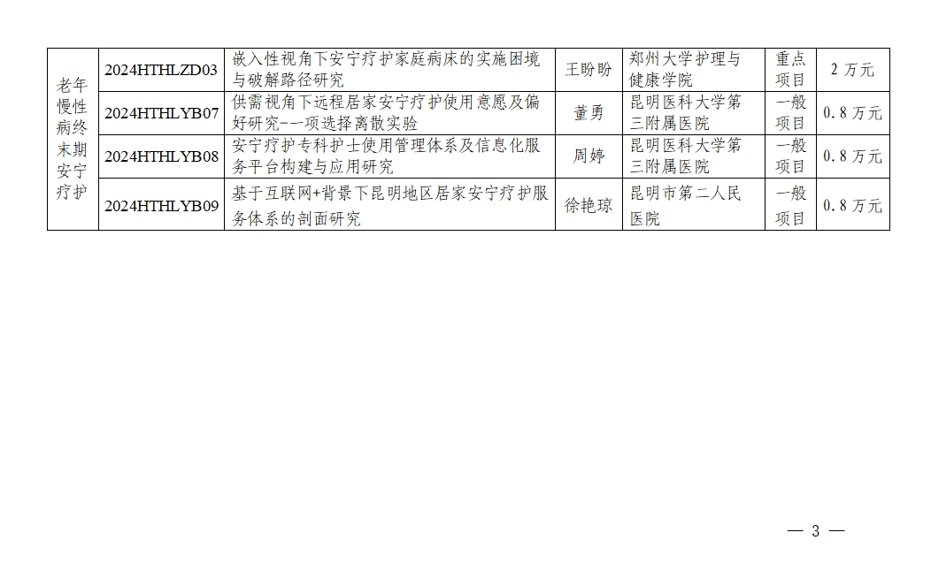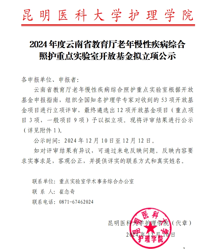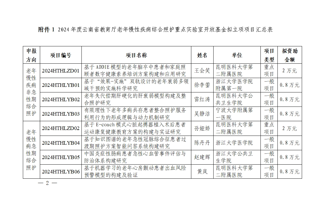 2024年度云南省教育厅老年慢性疾病综合照护重点实验室开放基金拟立项公示
