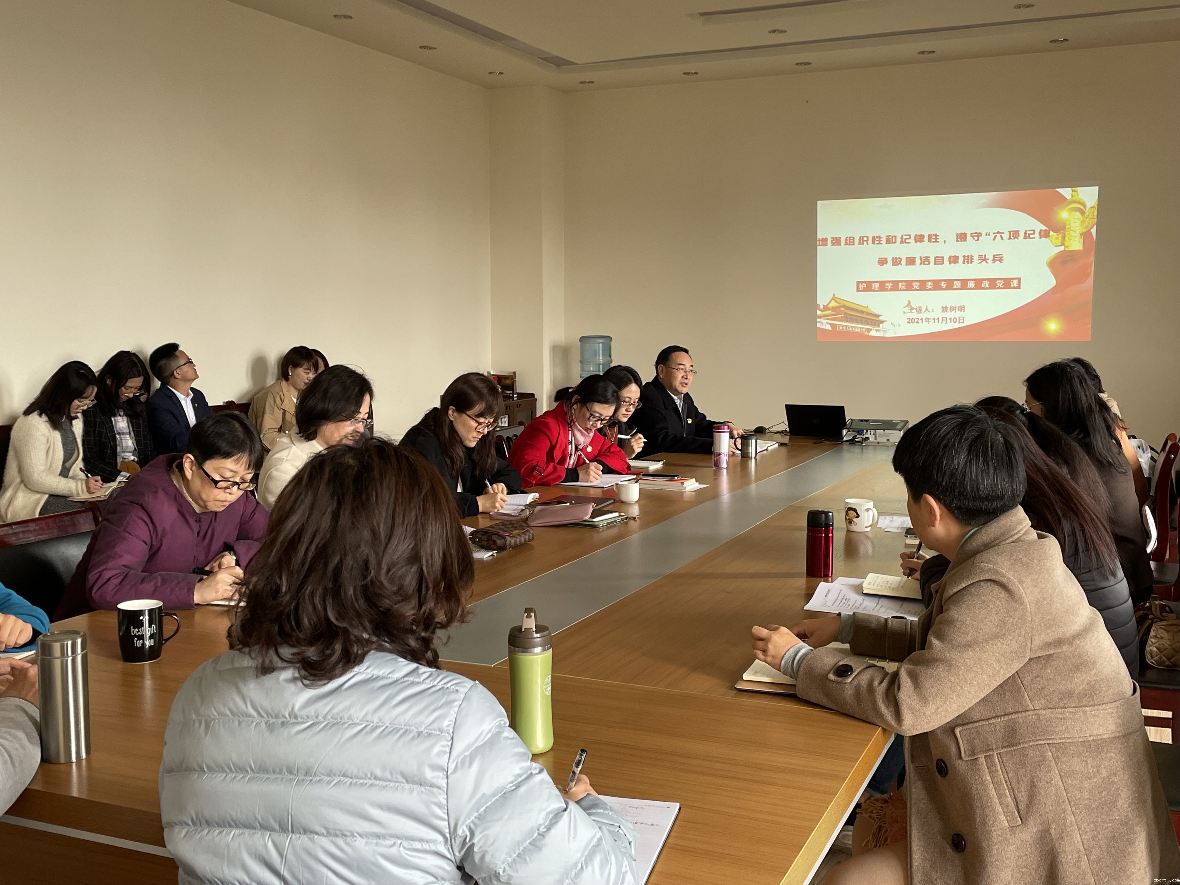 20211110日下午,护理学院党委在护理学楼502会议室组织开展《增强组织性和纪律性,遵守“六项纪律”,争做廉洁自律排头兵》专题廉政党课,主讲人为护理学院党委书记姚树明,全体教师参加学习。