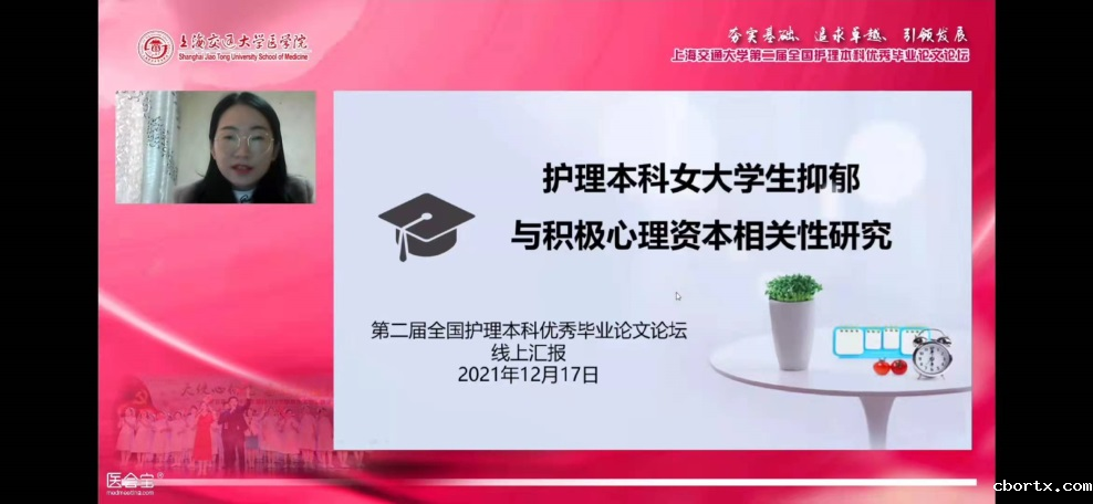 2021年12月,我院2021届护理学专业本科毕业生朱梦娇同学的论文《护理本科女大学生抑郁与积极心理资本相关性研究》从全国报名参赛的58篇本科生毕业论文中脱颖而出,入选“上海交通大学第二届全国护理本科优秀毕业论文线上论坛”汇报论文并最终荣获三等奖。