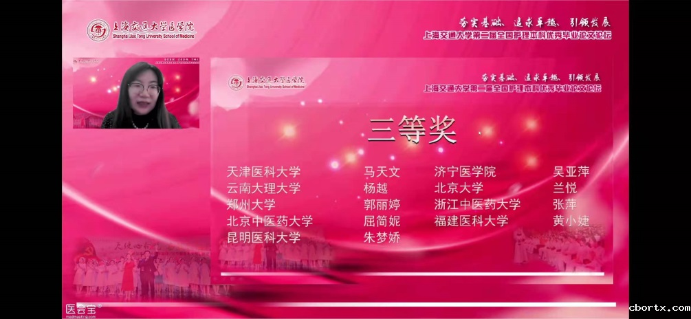 上海交通大学举办的“全国护理本科优秀毕业论文线上论坛”目前为国内护理本科院校优秀毕业论文交流的高水品盛会,国内各高水平大学均参与其中。我院朱梦娇同学的毕业论文依托“2020年的省级大学生创新性实验计划项目”孵化,成果显著,充分展现出我院近几年深化内涵发展,教师全过程培育创新人才的优秀成果。