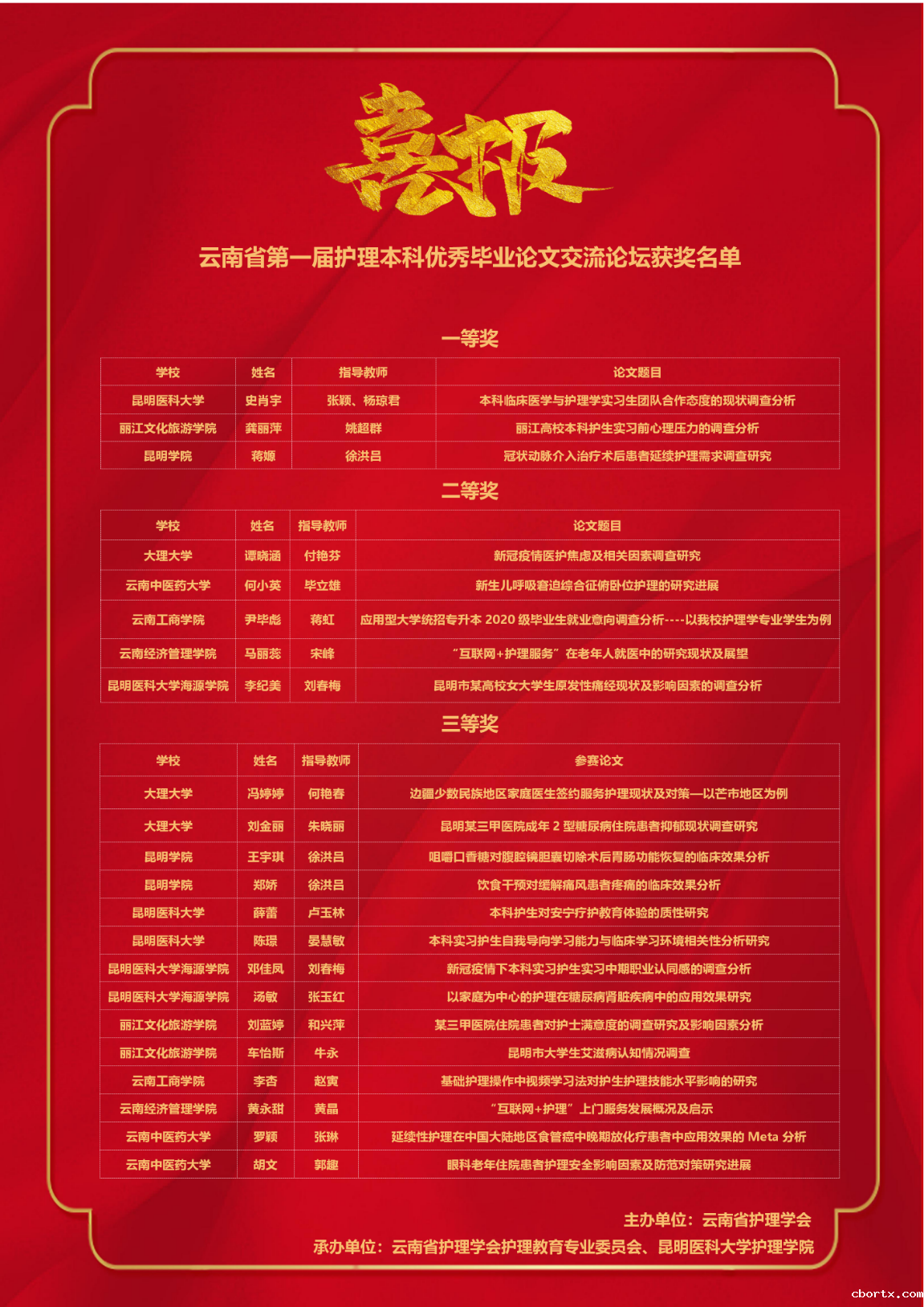经专家现场评审,本次论坛共评出一等奖3名、二等奖5名、三等奖14名。云南省护理学会教育专业委员会主任委员、18luck备用登录研究生院院长张颖教授宣读了优秀毕业论文获奖名单,并向获奖选手表示祝贺。希望本次论坛的举办能够为推动我省护理本科人才科研能力与创新精神的培养起到良好的示范作用,18luck备用登录护理学院愿与各护理院校同仁一道,为护理专业建设、学科发展携手共进!