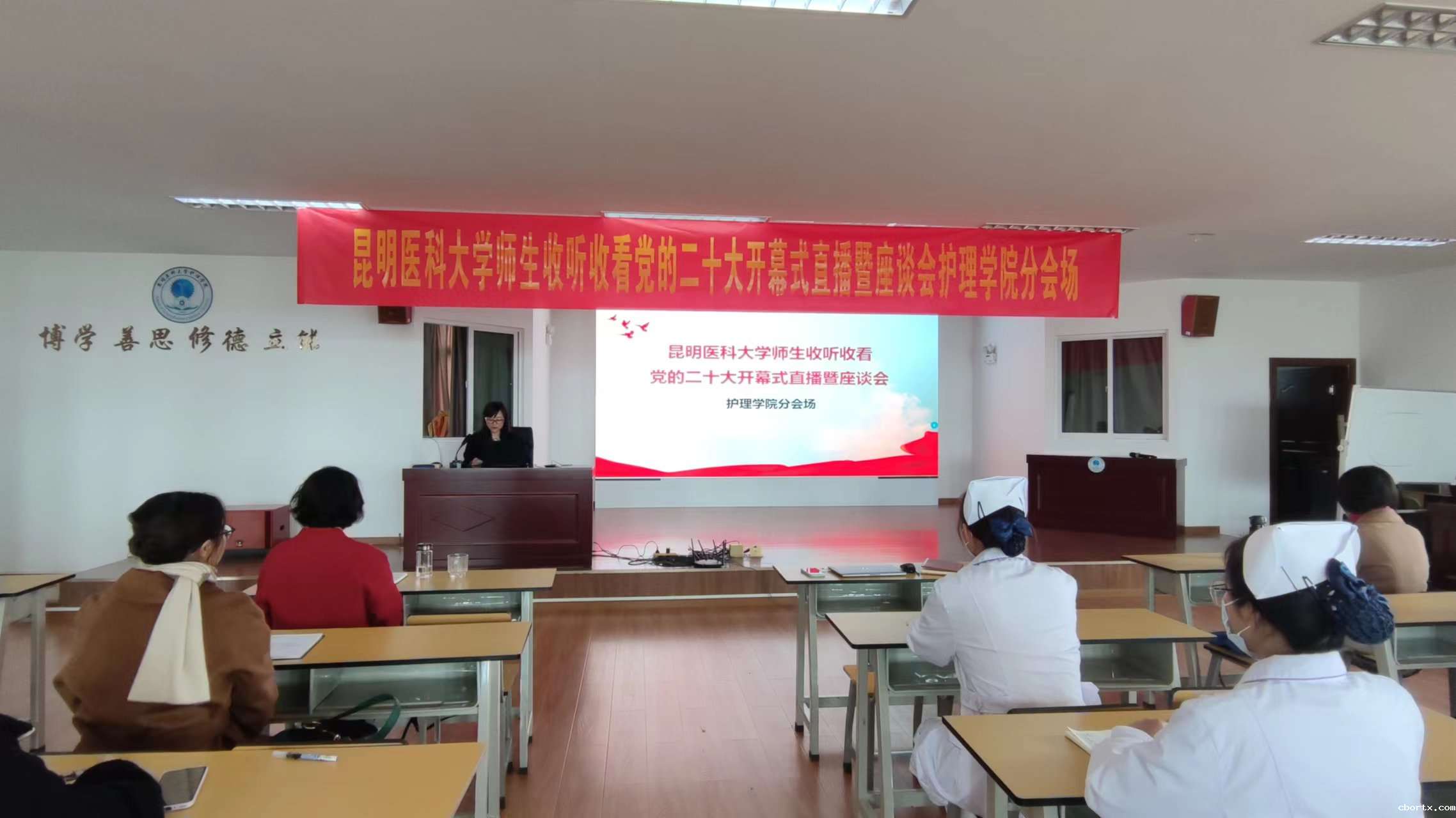 10月16日上午,护理学院采取多种方式组织全院师生收听收看中国共产党第二十次全国代表大会开幕会,认真学习习近平总书记代表第十九届中央委员会向党的二十大作的报告。按照学校、学院党委的统一部署,护理学院在护理学楼501教室设立了分会场,党委委员、各党支部书记及党员代表、各办、系、中心主任、教师代表、团干部代表参加分会场的集中学习及座谈会。各党支部组织全体党员,学院团委组织广大团员青年、群众,实习生辅导员组织平政校区实习生通过中央媒体的直播观看了大会实况。