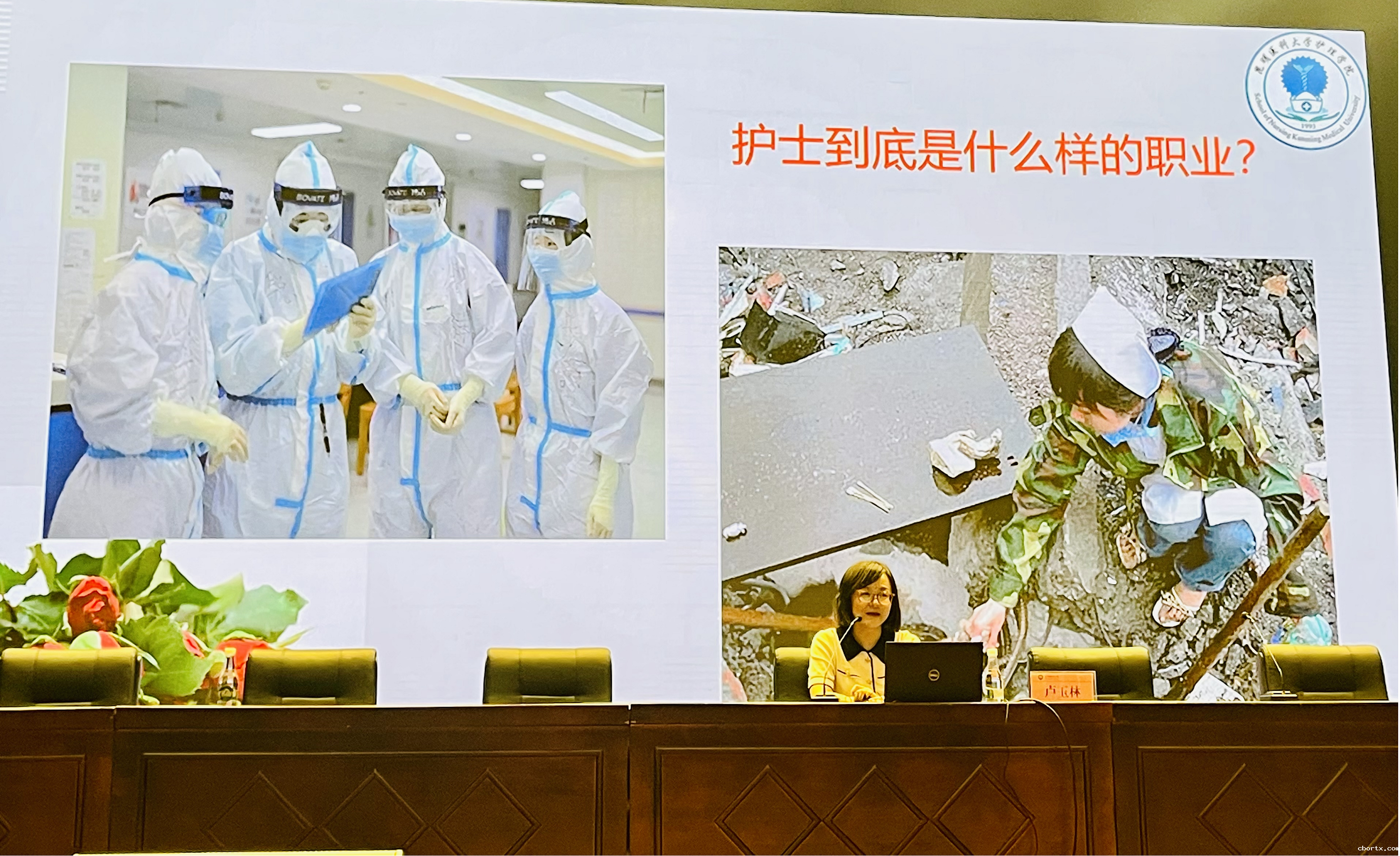 会议第二阶段。卢玉林以“爱与专业,让平凡伟大”为主题面向全体新生进行了院史院情教育和专业教育,为2023级新生上了深刻而不失生动的一堂课。她全方位、多角度、宽领域介绍了学校和学院的发展历史与基本情况,并从人才培养方案、师资力量、护士队伍建设成效、国内外护理专业教育、重点研究领域等方面切入,深刻阐述了护理学科的意义与内涵。