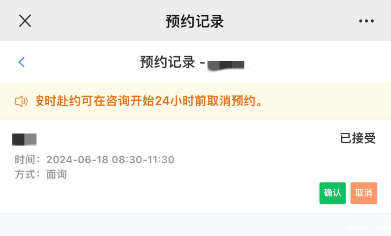 4.预约完成后,可在主页选择“预约记录”查看预约状态,状态为“已接收”的预约请尽快完成确认,状态为为“已确认”的代表预约成功,如不能在预约时间段赴约可在咨询开始1小时前取消预约。
