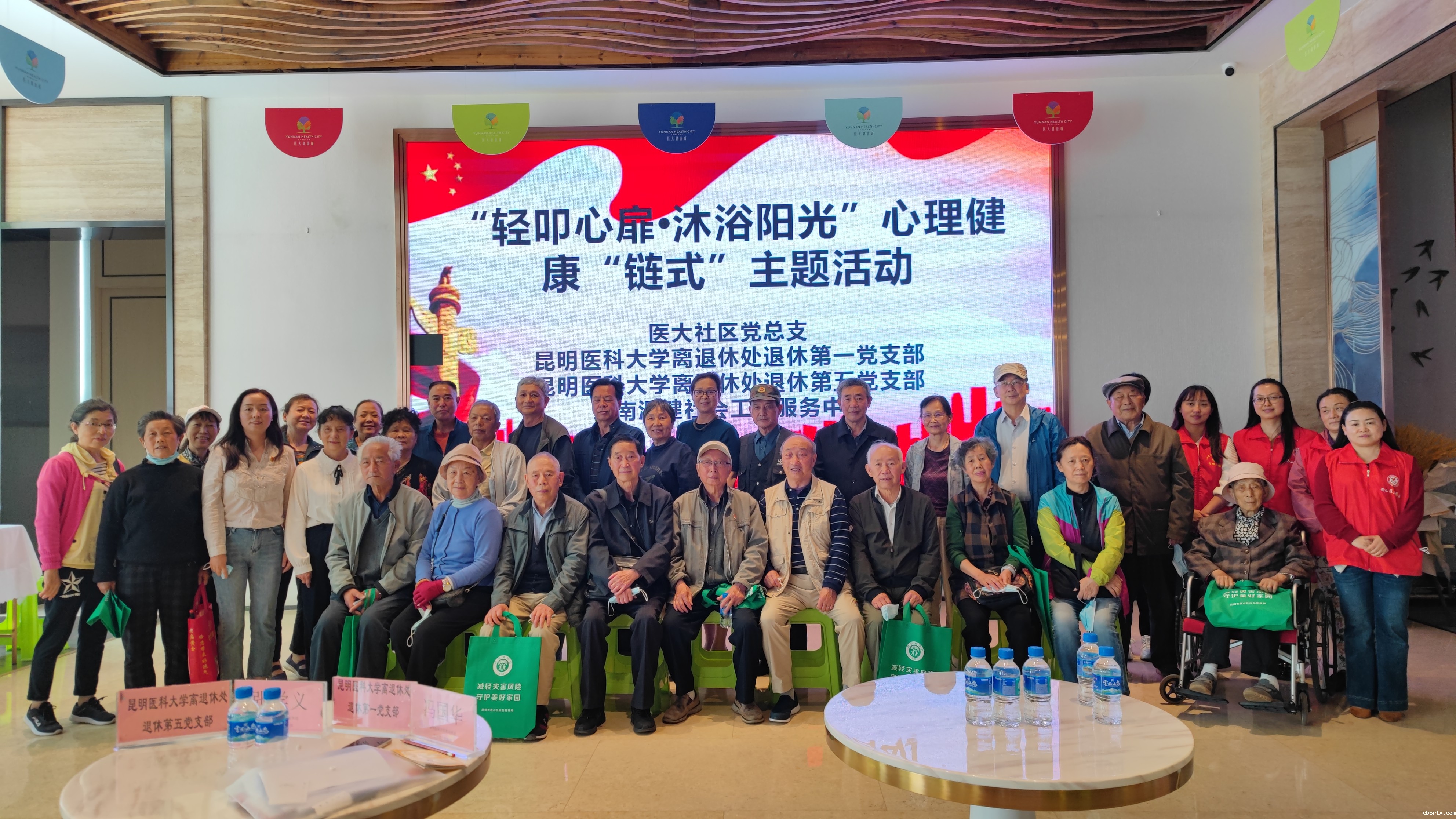 2022年5月11日,退休第一党支部联合退休第五党支部、医大社区党总支、云南汇健社会工作服务中心在医大健康城共同开展“轻叩心扉?沐浴阳光”心理健康“链式”主题活动。