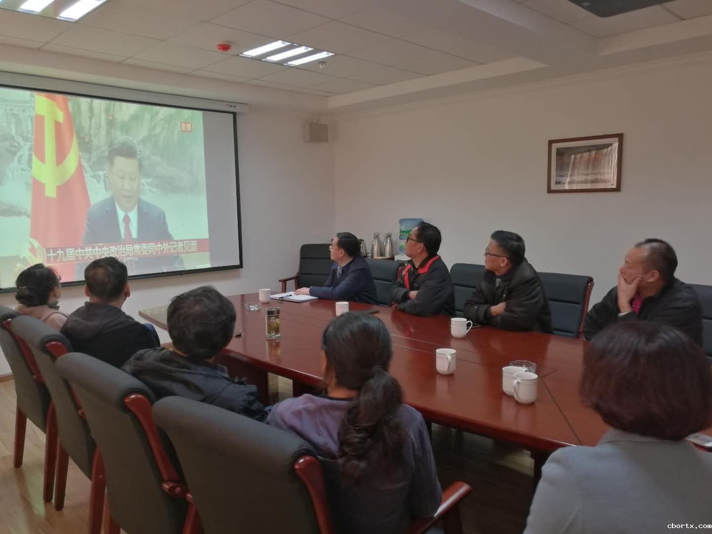 2017年10月25日上午,在平政校区知行楼502会议室,离退休处党委组织收看新一届中央政治局常委与中外记者见面会实况,收看会由处党委书记姚树明主持,部门在职人员和部分离退休老同志共18人参加了收看。