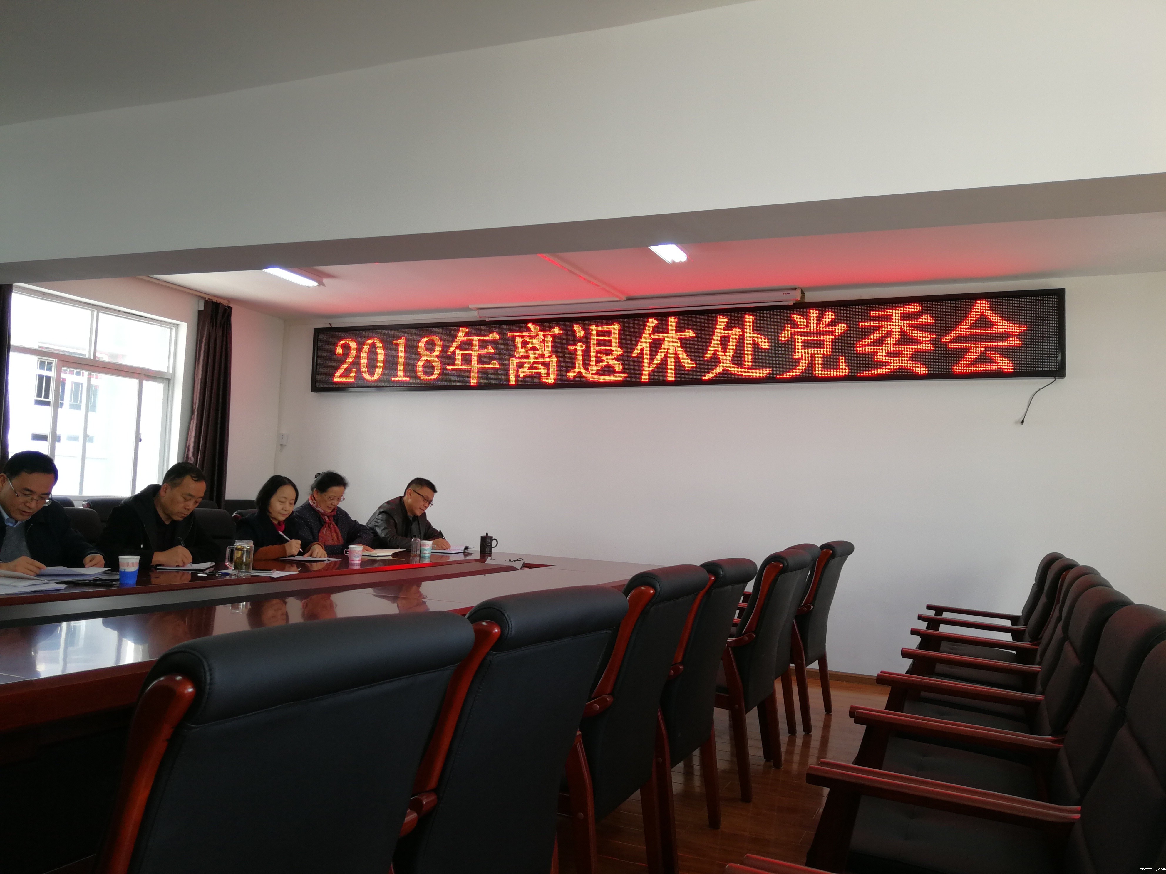 离退休处党委于2018年3月9日(星期五)下午3点在平政校区办公室三楼304会议室召开离退休处党委会。会议由党委书记姚树明同志主持,主要研究以下内容:一是研究杨林、贾守春担任正科事宜;二是传达学习学校2018年党政工作会议精神;三是传达学校3月6日安保维稳工作会议精神;三是通报2017年度离退休综合考核工作和党风廉政考核检查反馈意见;四是部署党支部专题组织生活会和民主评议党员活动;五是研究党支部书记、支委培训和开展“主题党日”活动事宜;六是研究党委中心组今年学习计划、老同志思想政治意识形态工作、党风廉政工作、工会统战工作、群团组织工作。