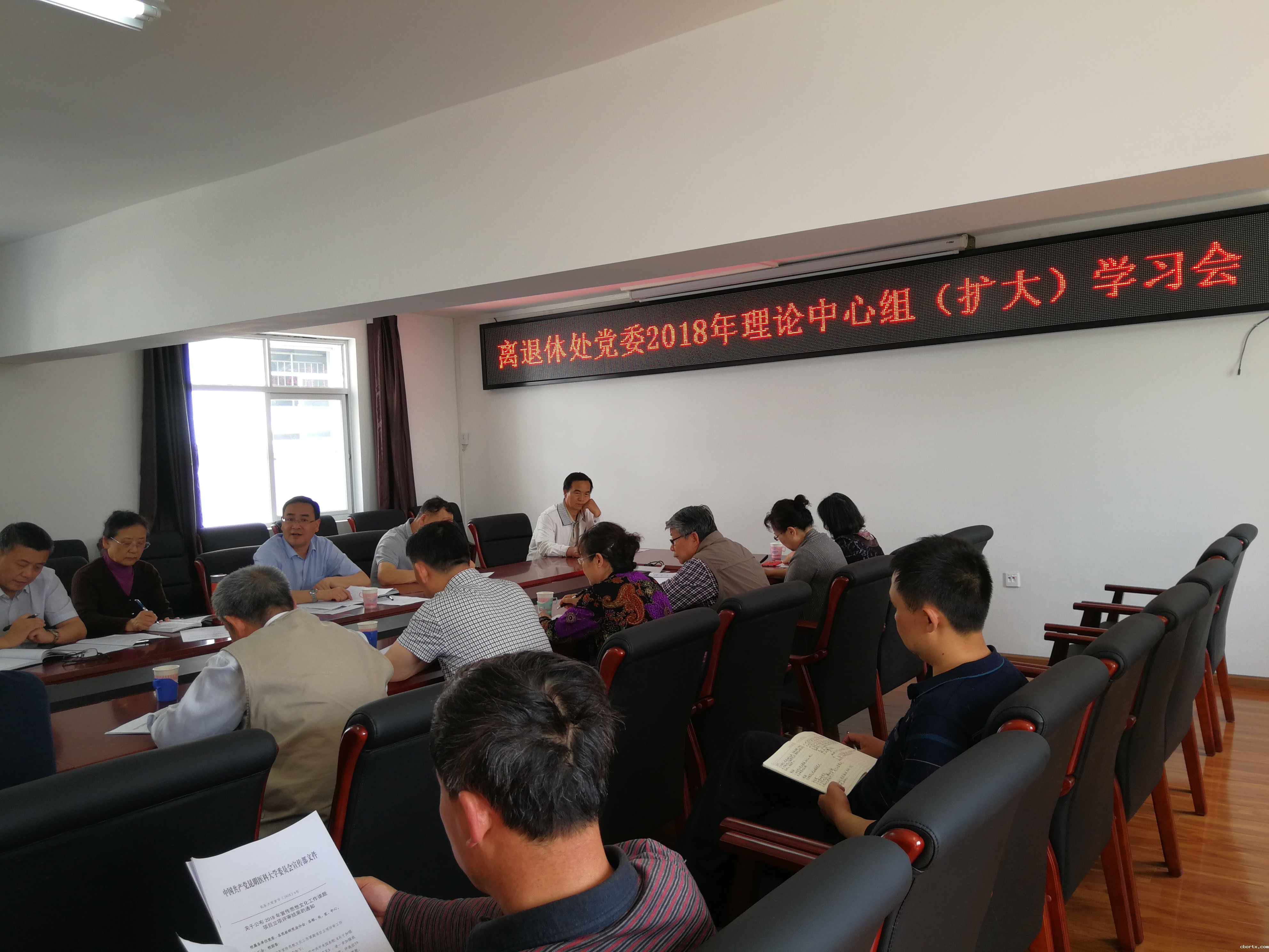 离退休处党委于2018年4月26日(星期四)下午在平政校区服务管理中心三楼会议室召开离退休处党委理论学习中心组(扩大)会。会议由党委书记姚树明同志主持,党委委员、党支部书记及部门工作人员一共18人参加了学习。
