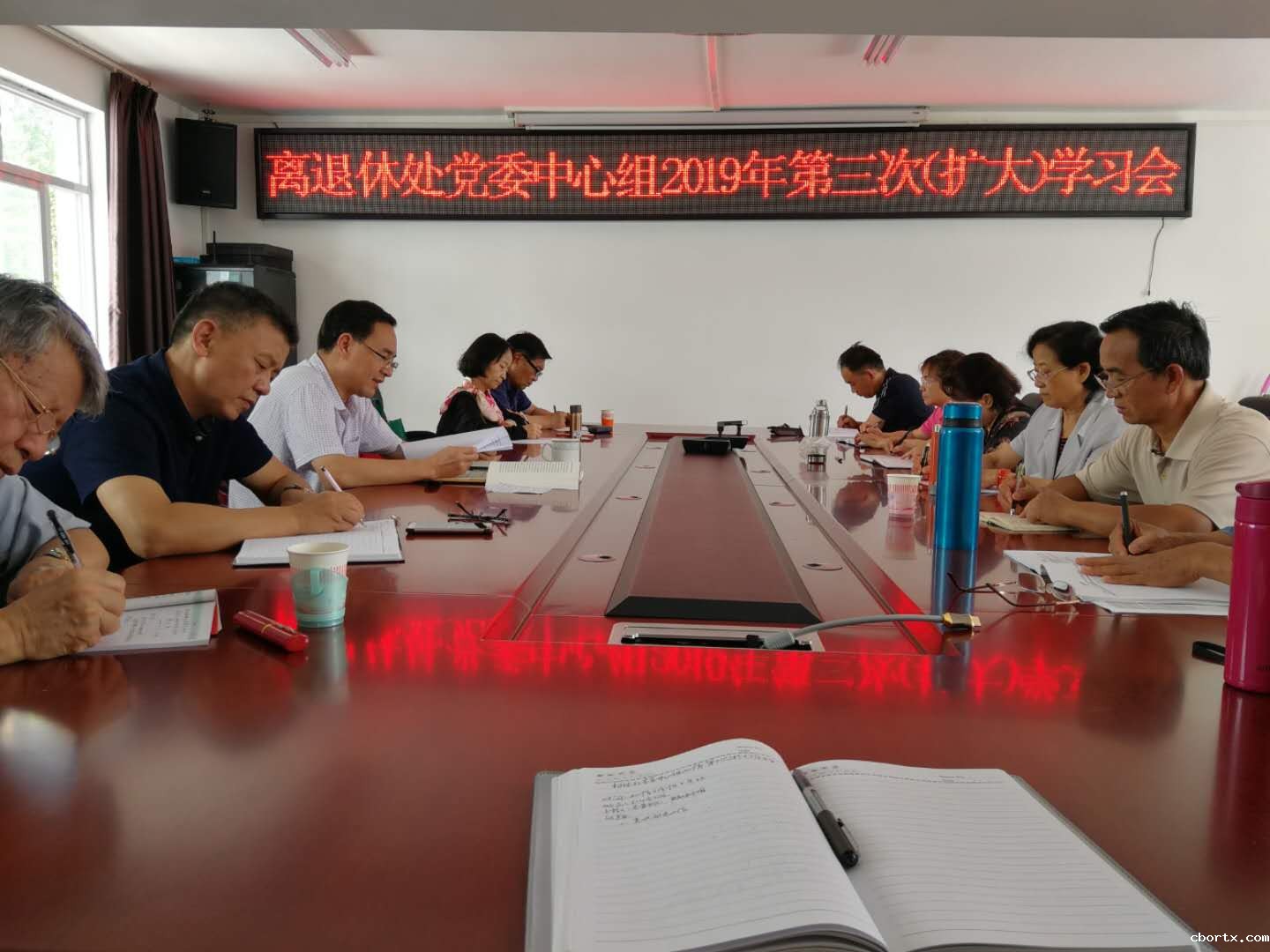离退休处党委于2019年6月19日(星期三)下午3点在平政校区办公室三楼304会议室召开离退休处党委中心组(扩大)学习会。会议由党委书记姚树明同志主持,党委委员、党支部书记一共14人参加了学习。
