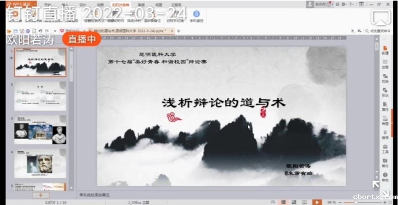 为保障辩论赛的顺利开展,我校邀请云南民族大学法学院博士欧阳若涛老师以“钉钉”线上培训的方式对各学院指导教师、参赛同学及团委社团部全体工作人员进行辩论赛培训,校团委副书记张培楠老师主持会议。以“浅析辩论的道与术”为主题,欧阳若涛老师分享了一些个人比赛经验,简要阐述了对辩论赛的基本认识。他将辩论六要点与四位辩手的分工结合讲解,强调不同辩手对各自辩论方向的把握,让同学们对高深的辩论体系有了明确的认知。欧阳若涛老师还与大家分享了具有辩论思维的意义和辩论的哲理价值。整个培训会深入浅出,举例生动,干货满满,将理论与实际相结合,使同学们受益匪浅。