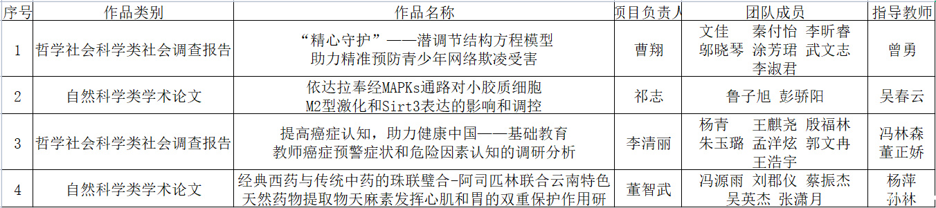 根据共青团中央《关于开展第十八届“挑战杯”全国大学生课外学术科技作品竞赛作品申报工作的函》要求,经省级组委会评审研究,拟推荐我校在第十二届云南省大学生课外学术科技节获特等奖的4件作品参加第十八届“挑战杯”全国大学生课外学术科技作品竞赛。具体作品信息如下: