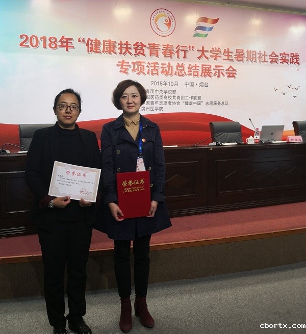 近日,由共青团中央学校部主办,全国医药类高校共青团工作联盟、中国青年志愿者协会“健康中国”志愿服务总队、滨州医学院承办的2018年“健康扶贫青春行”大学生暑期社会实践专项活动总结展示会在滨州医学院举行。我校团委荣获全国“优秀组织单位”、校团委皮筱娟老师荣获“优秀指导教师”。