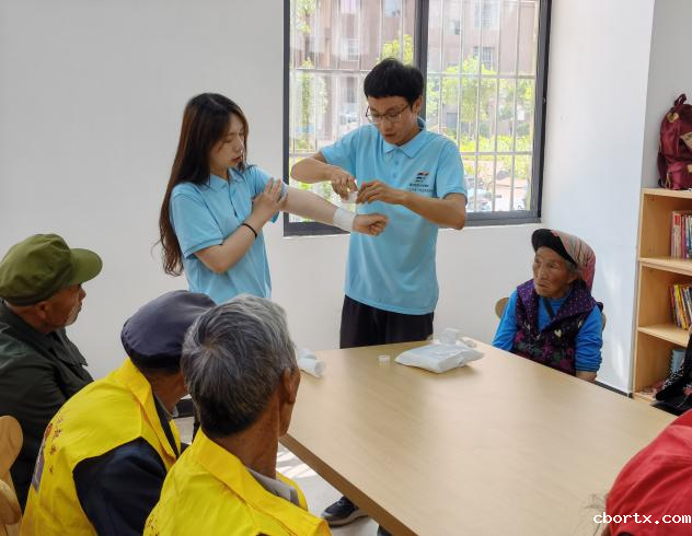 除此之外,微光之窗服务团还沿街或在活动室里给当地的老人测量血压,对于血压过高或过低的老人,间歇一段时间再次对他们进行测量,经过多次测量,得到一个较为准确的血压值,并对血压值不在正常值范围内的老人提供一些有关生活习惯和饮食的建议。有红十字会急救证书的团队成员还向老人们展示了受伤时使用绷带的包扎方法以及一些在紧急情况下可以用到的急救知识。