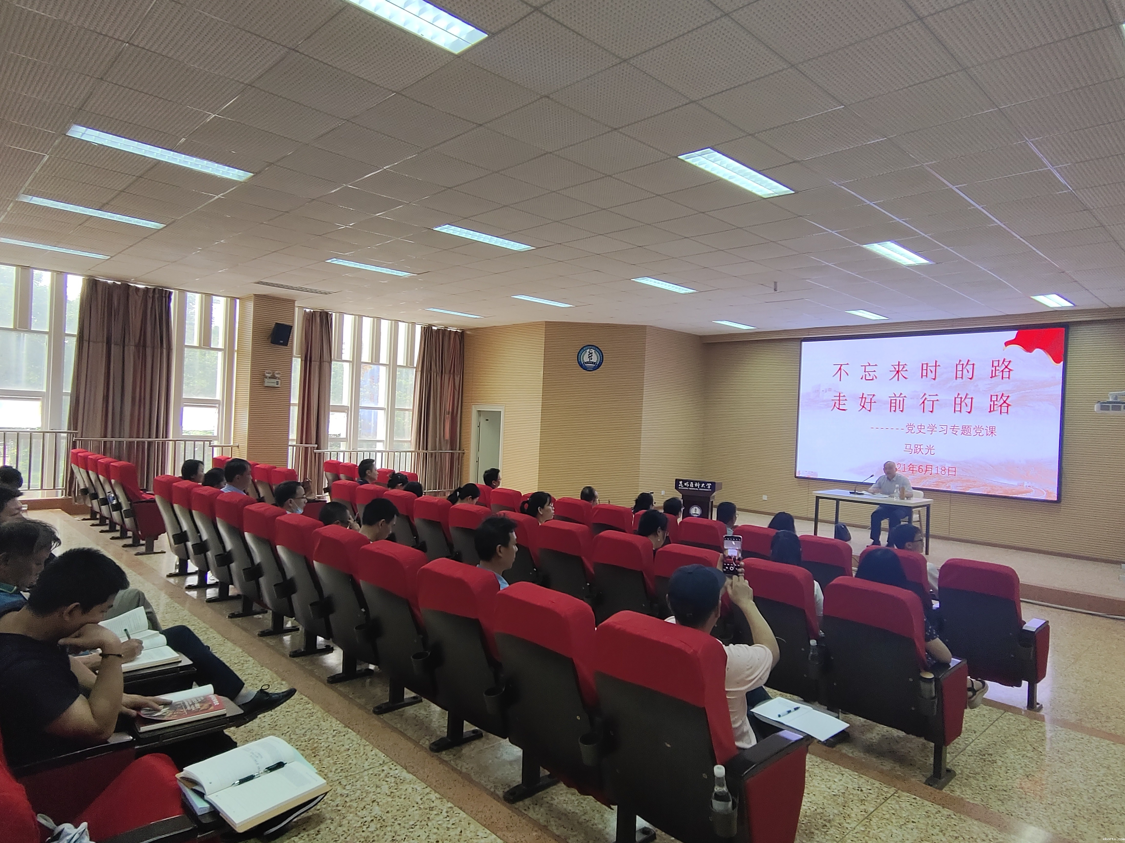 根据党史学习教育相关要求,资产处党支部与财务处党支部等于6月18日下午联合邀请校级领导马跃光同志在人文学院报告厅为全体党员同志作题为《不忘来时的路,走好前行的路》专题党课。 他从历史为什么选择共产党、星星之火可以燎原、中国道路为什么行、我们应该怎样规划我们的工作等几个方面为同志们做了精彩讲述,资产管理处支部全体党员同志参加学习。
